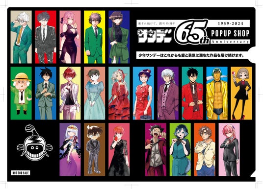 創刊65周年記念イラストを起用したグッズをはじめ、連載中の作品や過去に連載された作品などのオリジナルグッズを販売のほか、読者にとっては特に馴染み深い、「週刊少年サンデー」ロゴや「サンデーなまずくん」グッズも登場。また、レジでのお会計5,000 円(税込み)以上のご購入で、購入特典「A4 クリアファイル」(※なくなり次第終了)のプレゼントも実施いたします。