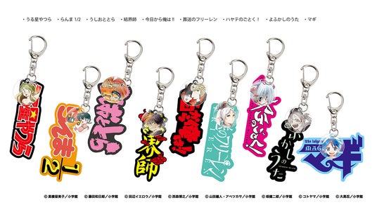 うる星やつら、らんま1/2、うしおととら、結界師、今日から俺は!!、葬送のフリーレン、ハヤテのごとく!、よふかしのうた、マギ など、作品のロゴをラバーキーホルダーにしたアイテム。イラストのアクリルキーホルダーが付属します。
