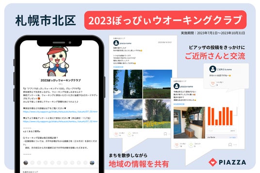 地域住民同士で交流しながらウオーキングによる運動習慣で健康維持を目指すため、札幌市北区ではピアッザを活用した住民参加型企画を実施しました。ウオーキング中に見える街の写真をピアッザで共有しながら1日8,000歩を目指すこのイベントは、地域住民による街の魅力再発見と健康維持・促進に繋がり、200件以上の投稿が集まりました。
