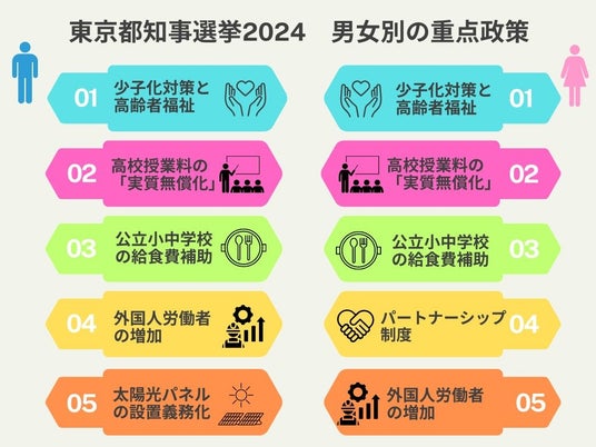 男女で関心を集めた上位3項目は「少子化対策と高齢者福祉」「高校授業料の『実質無償化』」「公立小中学校の給食費補助」で共通していました。