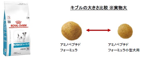 今回、小型犬を飼育する割合が高い日本市場において待望のフード「アミノペプチド フォーミュラ 小型犬用」が発売されました。アミノ酸レベルまで超低分子化されたフードのため、食物アレルギーによる皮膚・消化器症状を呈する小型犬に給与することを目的として、特別に調製された食事療法食です。また本製品は製造工程におけるアレルゲンの混入を防ぐため、徹底した製造管理とDNA解析でコンタミネーションを排除しています。