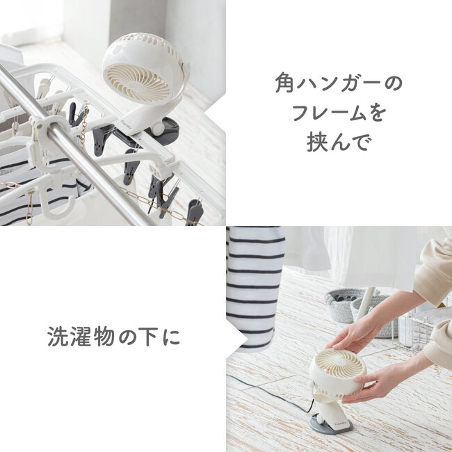 共働き世帯の増加、近年の花粉・粉塵による影響もあり室内干しは物干しの定番になりつつあります。また、洗濯専用の部屋であるランドリールームを自宅に作るなど、時間や天候に応じて一時的に室内干しをするだけでなく、生活スタイルに合わせて常に室内干しをする人が増えています。しかしながら室内干しをすると、洗濯物の乾きにくさや生乾き臭に悩まされることが少なくありません。そこで当社は、物干しスタンドや洗濯用のピンチハンガー(角ハンガー)に取り付けて効率的に洗濯物を乾かすことができる『フランドリー・クリップ式サーキュレーター』を発売します。