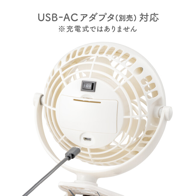 本商品には1.5mのUSBケーブルが付属しており、電源にはアルカリ乾電池だけでなく、USB-ACアダプター電源(別売)が使用できます。自宅のコンセントを利用すれば電池切れの心配もなく、連続運転可能です。また、180分タイマー運転も可能です。