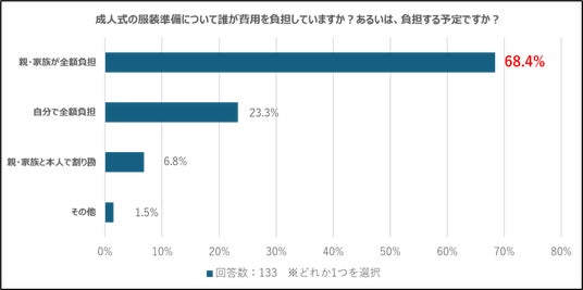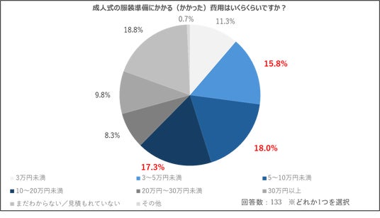 - 7割近くの新成人が成人式の服装の費用を「親・家族」に負担してもらっている現状も明らかに。多くの人が3万円以上を成人式の服装にかけており、「5万円~10万円」の費用を負担している人が18.0%と一番多い割合に。