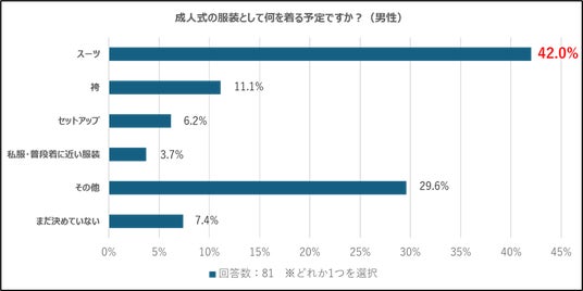 - 成人式の服装として、「スーツを準備する予定」と回答した人が全体の3割越えとなり、男性では42.0%と半数近くに。