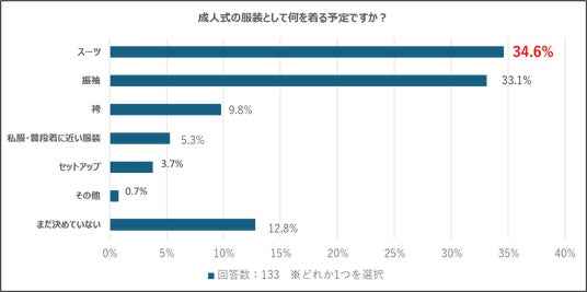 成人式の服装として「スーツを準備する予定」と回答した人が34.6%と一番多く、男性では半数近く(42.0%)も占めていることが明らかになりました。男性では特に、スーツの需要の高さがうかがえます。