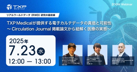 本ウェビナーでは、この研究の内容と意義に加え、TXP Medicalが提供するリアルワールドデータ(RWD)の特長や、製薬企業による臨床研究や疾患啓発への応用例をご紹介します。急性期×電子カルテ×医師主導の研究支援体制がもたらす価値を、事例を交えてお伝えします。