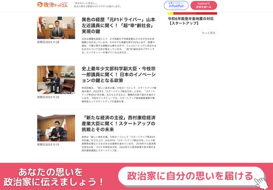 『政治ドットコム』では、政治家インタビュー記事などのコンテンツ充実はもちろんのこと、皆様の気になるテーマにお応えし、『PoliPoli』『PoliPoli Gov』といった各サイトとの連携強化やイベント企画を行ってまいります。