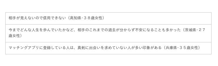 しかし、マッチングアプリに対して不安な意見もあるようです。マッチングアプリでのパートナー探しは「なし」「どちらとも言えない」と回答した人からは、以下のような意見がありました。