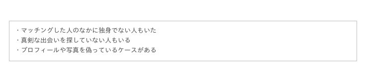 前述したとおり、相手のことがプロフィール・写真でしか分からないことが、こうしたデメリットにも繋がっているようです。マッチングアプリ上の情報はあくまで参考程度に留め、実際に対面してからしっかりと相手を見極めるものと捉えるのが良さそうです。