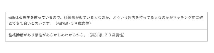 withの特徴は、心理テストや性格診断で相性の良い人を見つけることができるという点です。他のアプリには無い独自のサービスなので、プロフィールだけで判断することに不安を感じている人などがwithを選ぶ傾向にあるのかもしれません。