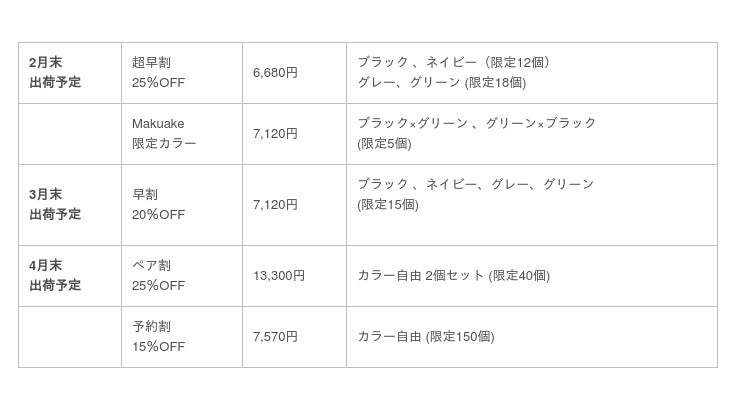 ご用意したリターンは12種類。割引率に加え、出荷時期も異なりますのでご注意ください。2個セットもご用意しましたので、ご夫婦やご友人と一緒に購入いただくと少しお得です。