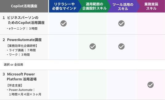 Copilotの部分的な使い方にとどまらず、リテラシーやマインド、企画設計や活用スキル、業務実装スキルの定着まで包括的に支援することでお客さまのビジネスに革新をもたらします。