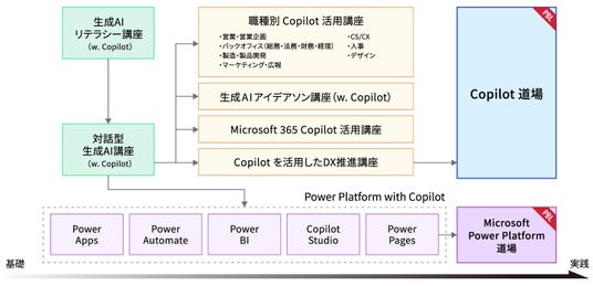 この障壁に対し、「Copilot道場」や「Microsoft Power Platform道場」の研修内にて、各社のデータを扱い、PoCまでやり抜く伴走型研修により乗り越え、成果創出を実現します。