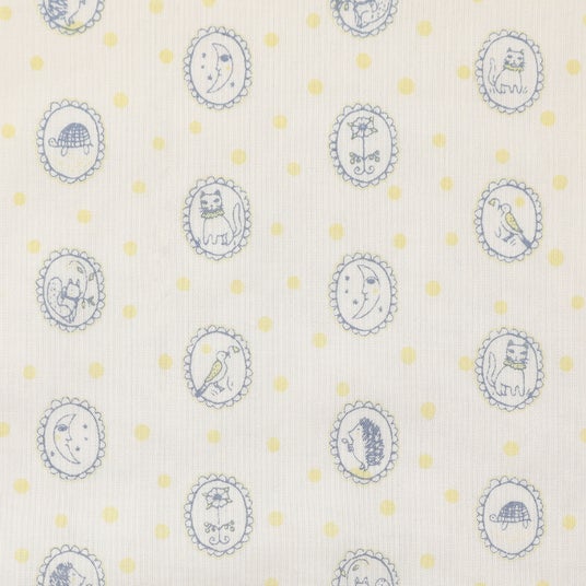 小鳥やハリネズミなどのモチーフがやわらかなタッチで描かれたテキスタイル。ビンテージ感のあるデザインをさりげない色使いで華やかに表現しました。