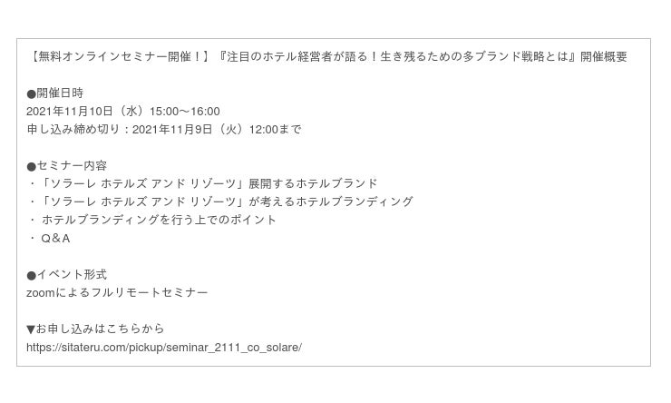 衣服・ライフスタイル産業が抱える社会的課題をクラウドサービス「sitateru CLOUD」で解決するシタテル株式会社(本社:熊本県熊本市、代表取締役:河野秀和、以下シタテル)は、宿泊施設の経営者や宿泊業のブランディングに携わる方を対象に、ソラーレ ホテルズ アンド リゾーツ株式会社の代表取締役社長 井上理氏お迎えし、無料オンラインセミナー『注目のホテル経営者が語る!生き残るための多ブランド戦略とは』を11月10日(水)に開催いたします。