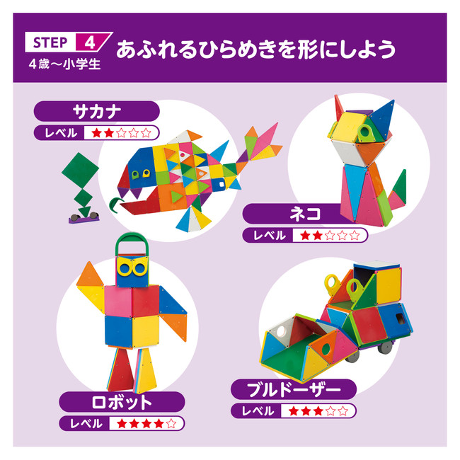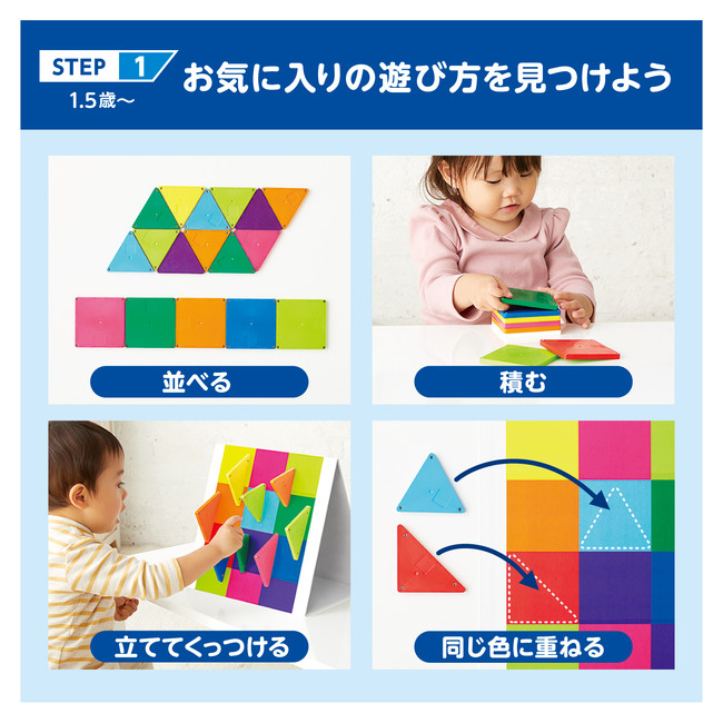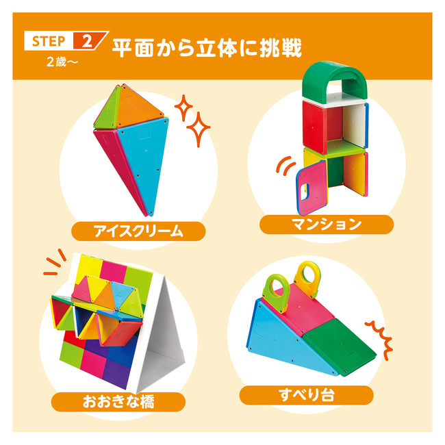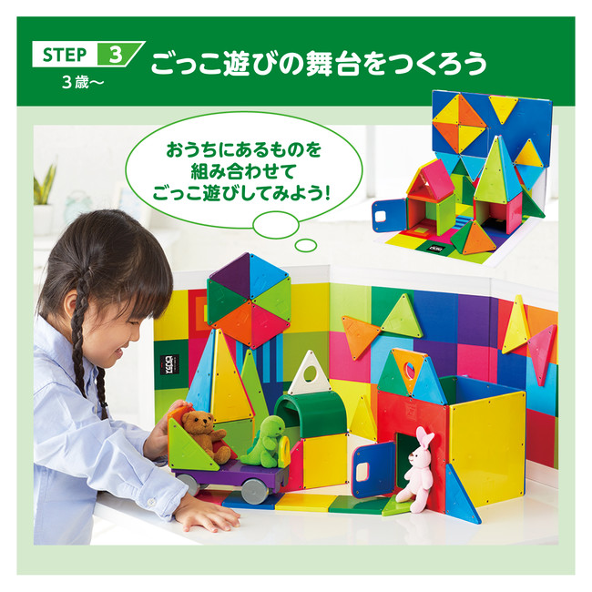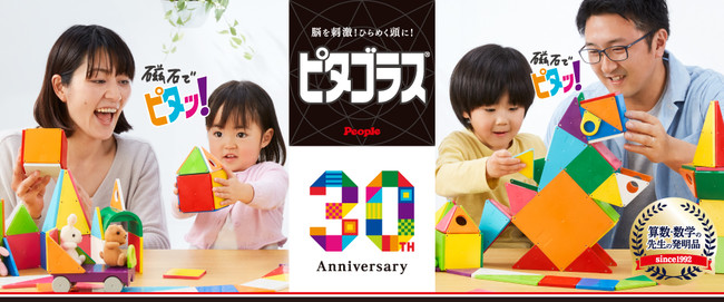 不思議な磁石でピタッ!とくっつけて楽しく遊んでいるうちに、自然と平面から立体をつくり上げるイメージをつかめるようになり、「空間認識力が育つ」「後々の算数に役立つ」と多くの子どもたちや保護者の方に支持されて、今年発売30周年を迎えます。