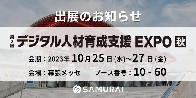 プログラミングスクール「SAMURAI ENGINEER(侍エンジニア)」を運営する株式会社SAMURAI(本社所在地:東京都千代田区、代表取締役 :高比良 直人)は、2023年10月25日(水)~27日(金)の3日間、幕張メッセで開催される展示会「デジタル人材育成支援 EXPO秋」に出展いたします。