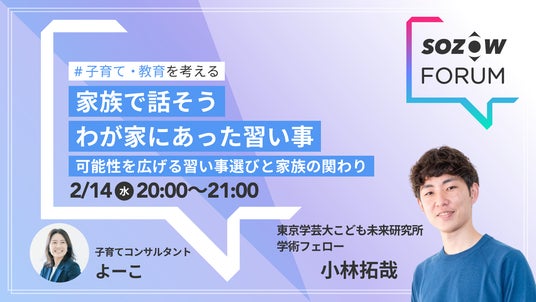 「好奇心から始まる学び」をコンセプトに、実社会に活きる学びをオンラインで全国の子どもたちに届けてきたSOZOW株式会社(所在地:東京都品川区、代表取締役:小助川 将)は、2月14日(水)に無料オンラインセミナー「SOZOWフォーラム ~家族で話そう わが家にあった習い事~ 」を開催いたします。