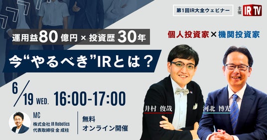 株式会社IR Roboticsは6月19日(水) 16:00より「IR活動」をテーマにオンラインセミナーを開催いたします。IRに携わる全ての方へ向けて、日々のIR活動に活かせる機会を提供いたします。