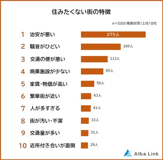 株式会社AlbaLink(本社:東京都江東区、代表取締役:河田 憲二)は、全国の男女500人を対象に「住みたい街・住みたくない街の特徴に関する意識調査」を実施し、そのデータをランキングにしました。