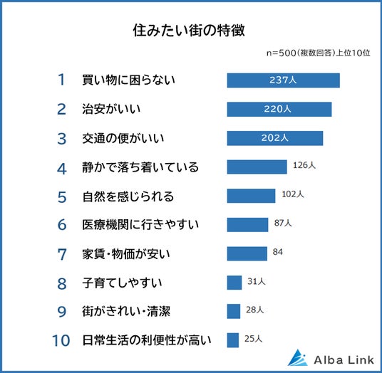 全国の男女500人に「住みたい街の特徴」を聞いたところ、1位は「買い物に困らない(237人)」でした。2位「治安がいい(220人)」、3位「交通の便がいい(202人)」も多くの票を集めています。
