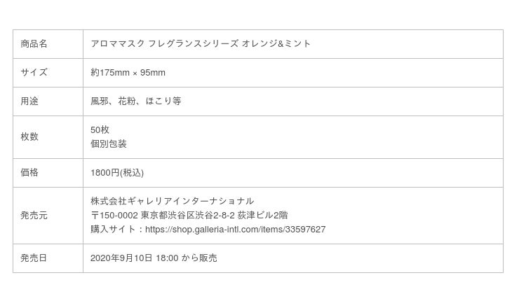 株式会社ギャレリアインターナショナル(本社:東京都渋谷区、代表取締役:阪崎英一郎)は、アロママスクシリーズよりオレンジ&ミント香り 不織布マスク 50枚入 フレグランスシリーズ(GI-AMK-007)を9月10日18時より発売致します。