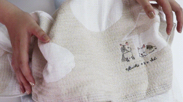 ふんわりしたガーゼを生み出すため、中層にはワタ糸と解撚糸を織り込み、程よい伸縮性でお肌に馴染むメレンゲのような仕上がりに。肌に触れる部分はコットン100%でやさしい使い心地が魅力です。