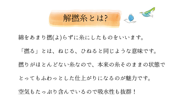 一般的なタオルで使われる撚糸は、強度を出すために糸を撚っていますが、一方で「硬くてゴワゴワする」傾向があります。解撚糸の良さは空気をたっぷり含むので、吸水性と柔らかさを生み出すので、ふわっとやさしい肌触り。お子様にもおすすです。
