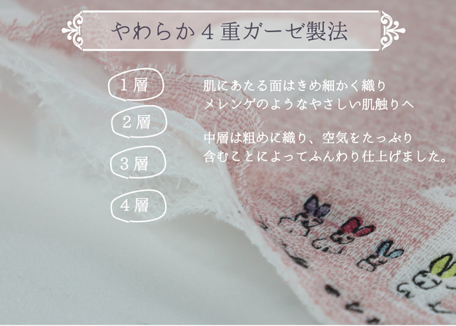 4重ガーゼで空気をたっぷり織りこみ、ふんわり。肌にあたる面はコットン100%で、中層はたっぷりと空気をふくむので、しっかり吸水し、柔らかく仕上げました。
