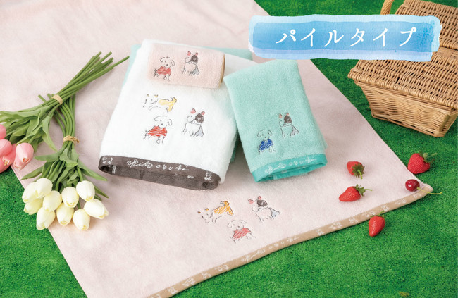 パイルタイプはしっかり吸水しふわっとボリューム感があるのが魅力です。通常の糸ではなく、今回のタオルにはオブチアキコさんのやさしさを表現するため「解燃糸」を使用し、ふっくらと仕上げました。犬のモチーフがとてもかわいく愛着が湧く一枚へ。