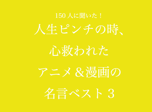 生きていれば誰しもが困難にぶつかります。そんなときに支えられた名言はありますか?TVマガでは「人生でピンチの時、心が救われたアニメ&漫画の名言」について150人にアンケート調査を行いました。ランキング形式で名言と作品情報、回答者のみなさんがその言葉に助けられた時のシチュエーションも紹介していきます。