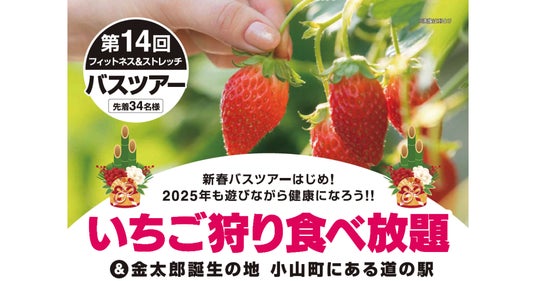 株式会社いーふらん(本社:神奈川県横浜市、代表取締役社長 鹿村大志、以下いーふらん)は、いーふらんが展開する「フィットネス&ストレッチ 健康の森」事業において、運動を通じた健康促進のみではなく、体験を通じたこころの充足、人と人とのつながりを「遊びながら」創出する会員限定バスツアーにおいて、1月は「新春バスツアーはじめ!いちご狩り食べ放題&金太郎誕生の地 小山町にある道の駅」ツアーを開催することをお知らせいたします。