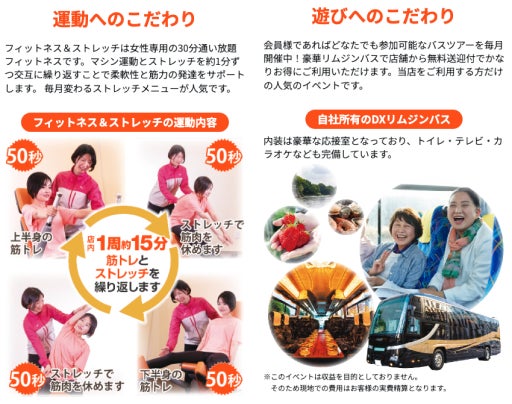 会員様限定でバスツアー企画を継続的に実施し、非日常の体験の中で一緒に参加する方々とのコミュニケーションを通じ、一緒に運動を頑張れる仲間をみつけることで「こころの充足」「社会的なつながり」を創出してまいります。