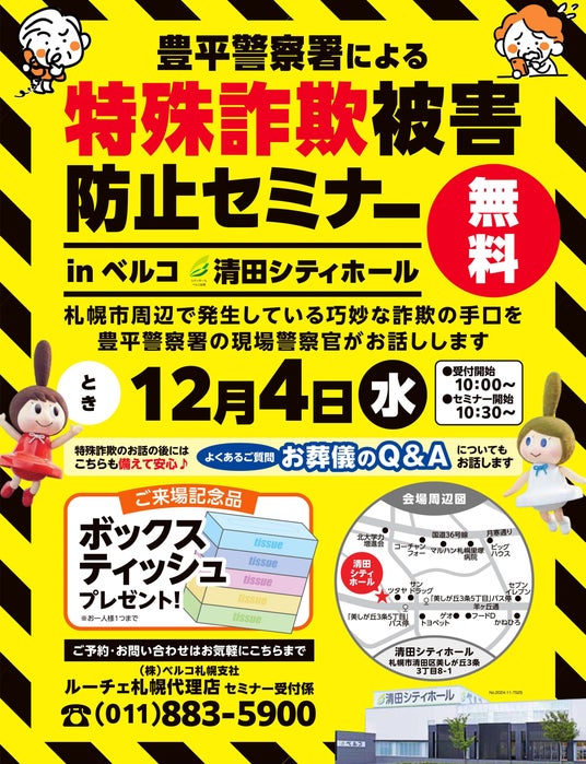 株式会社ベルコ(本社:大阪府池田市、代表取締役:齋藤 斎)では、清田シティホールにて、地域の皆さまが特殊詐欺被害に合わないよう、未然に防ぐための「特殊詐欺被害防止セミナー」を開催いたします。本セミナーでは、豊平警察署の現場警察官が札幌市周辺で発生している巧妙な詐欺の最新手口やその対策について、わかりやすく解説します。