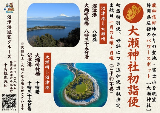 浜友グループの株式会社千鳥観光汽船(本社:静岡県沼津市、代表取締役:後藤武彦)が運営する、ちどり沼津港遊覧クルーズは大瀬神社初詣特別クルーズ便を1月中の土曜・日曜日に出航します。