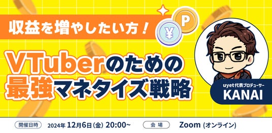 VTuber、IPコンテンツを通して日本と世界で新たな流通を生み出す“IPコンテンツの総合商社”株式会社uyet(ユエット)(本社:東京都渋谷区、代表取締役:金井洸樹・梶田大樹)は、2024年12月6日(金)20:00よりウェビナー「収益を増やしたい方!VTuberのための最強マネタイズ戦略」を開催します。