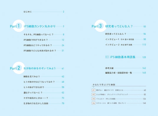 この本では、iPS細胞とは何なのかという疑問を入口に、生物学の歴史や、今まさに行われている研究の最先端、さらにはiPS細胞研究の未来について考えていきます。Part1ではまず、iPS細胞がどんな細胞なのか、初めて学ぶ人にもわかりやすく解説していきます。Part2では、ヒトの体のしくみを中心に、生物学のおもしろさをのぞいてみましょう。Part3では、iPS細胞の研究者へのインタビューを通じて、研究者の素顔にせまります。