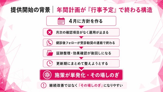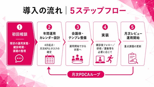 - 4月:年度方針とKPI確定/会議体立上げ/健診後フォロー設計