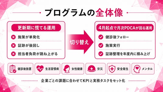 フラクタルワークアウト株式会社は、健康経営を「更新期に慌てる運用」から「4月起点で月次PDCAが回る運用」へ切り替えるため、健康経営の年間計画を実務カレンダーとして設計する支援サービスの提供を開始しました。
