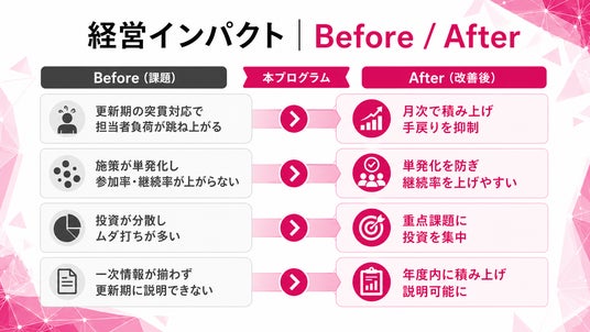 - 更新期の突貫対応を減らし、担当者負荷と手戻りを抑制