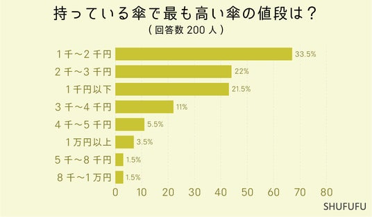 持っている傘で最も高い傘の値段を尋ねたところ、1位は「1千~2千円(33.5%)」、2位「2千~3千円(22%)」となりました。一番高い傘が3千円以下であると答えた方は7割以上になりました。傘は、値段の違いに関わらず雨に濡れないようにするという機能性の面では違いが出にくいことと、盗まれる心配もあるので、3千円以上の価格の傘は持つ必要がない・持ちにくいという理由もあるのかもしれません。