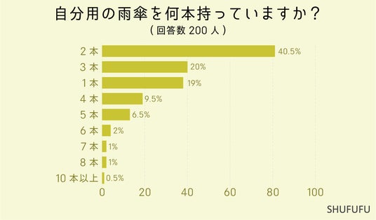 自分用の雨傘を何本持っていますか?(折りたたみ含む)の問いに対して最も多かったのが「2本(40.5%)」でした。 次いで「3本(20%)」「1本(19%)」という結果でした。 1~3本持っている方を合算すると8割近くになりました。