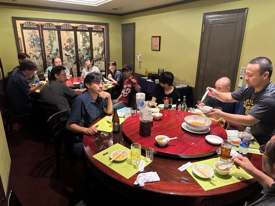 <慰安食事会の様子。一致団結して挑戦を続けていきます>