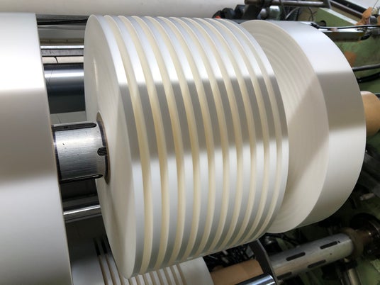 課題は素材の特性もさることながら、幅にもありました。幅1cm、厚さ 20ミクロン(0.02mm)のポリエチレン。これを長さ4000mのロール状にするというもので、直径は340mmにもなるといいます。