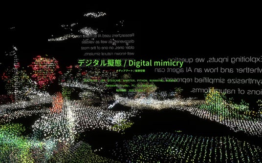 植物擬態は進化生物学の概念であり、植物物体が生理的または形態的に類似したほか他の生物に変化し、その適応度を高める現象を指す。植物の環境に対しての擬態は、AIが人間を模倣する相似性がある。AIが人間に模倣による図形と文字を創造すると、植物が周囲の環境に対して擬態するようにマッピングし、これによりAI 進化と自然進化の間の共通性を検討する。だから私はコンピュータに植物をテーマに人間の創造行為を模倣させた。