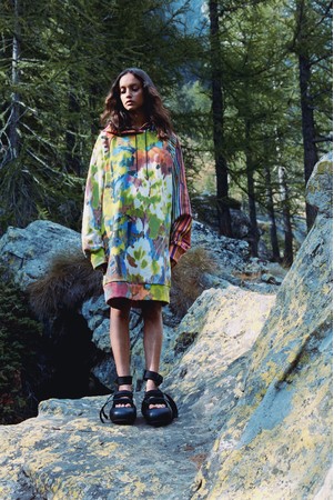 構築的なプロポーションのトップスや、ボディにフィットするスタイル、ゆったりとした幅広のキモノスリーブ、オーバーサイズのボリュームなどのディテールが魅力のTシャツ、フーディースウェットシャツ、ビスチェのように後ろをレースで留めたノースリーブのドレス、そしてすらりとしたラインが特徴の5ポケットパンツなど、自然の詩的なニュアンスが、ありとあらゆるスタイルに再構築されています。また、膝下丈のペンシルスカートなど、アシンメトリーに配置したストライプを通して、意図的に曖昧なシルエットを実現したスタイルも登場します。