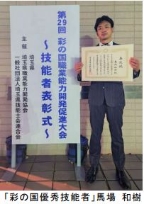 ポラスグループ ポラスハウジング協同組合(埼玉県草加市 代表理事:中内晃次郎)に所属する建築大工の馬場 和樹(ばば かずき)が、11月24日に開催された埼玉県主催の「第29回 彩の国職業能力開発促進大会~技能者表彰式~」において、埼玉県知事より「彩の国優秀技能 者(埼玉の名工)」の表彰を受けました。