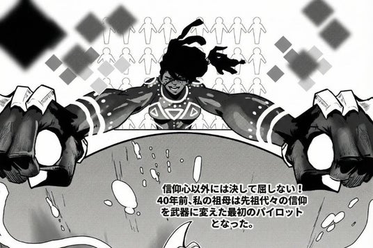 ジンバブエ神話の魚蛇神「ニャミニャミ」が巨大メカとして登場。「信仰(FAITH)」をエネルギー源とする世界で、信仰を持たない少年が戦うSFアクションです。