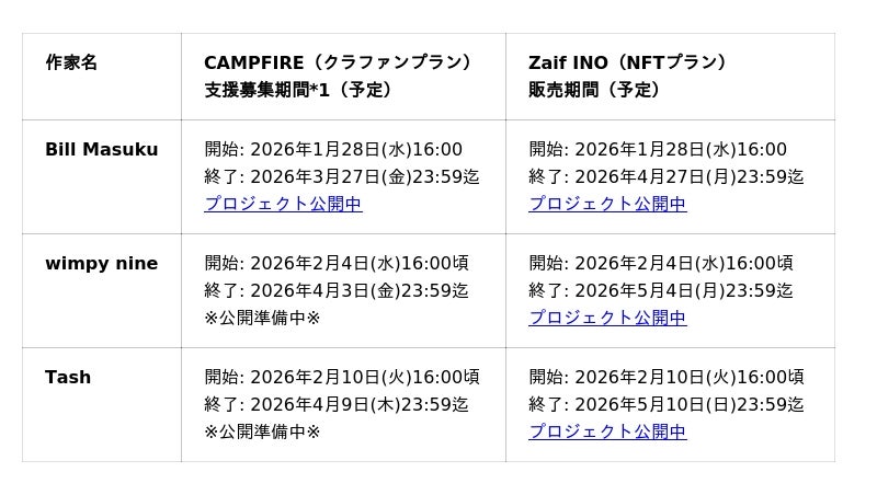 本プロジェクトは、クラウドファンディングサイトCAMPFIREとNFT販売を行うZaif INO特設サイトで支援者の募集スケジュールが異なります。